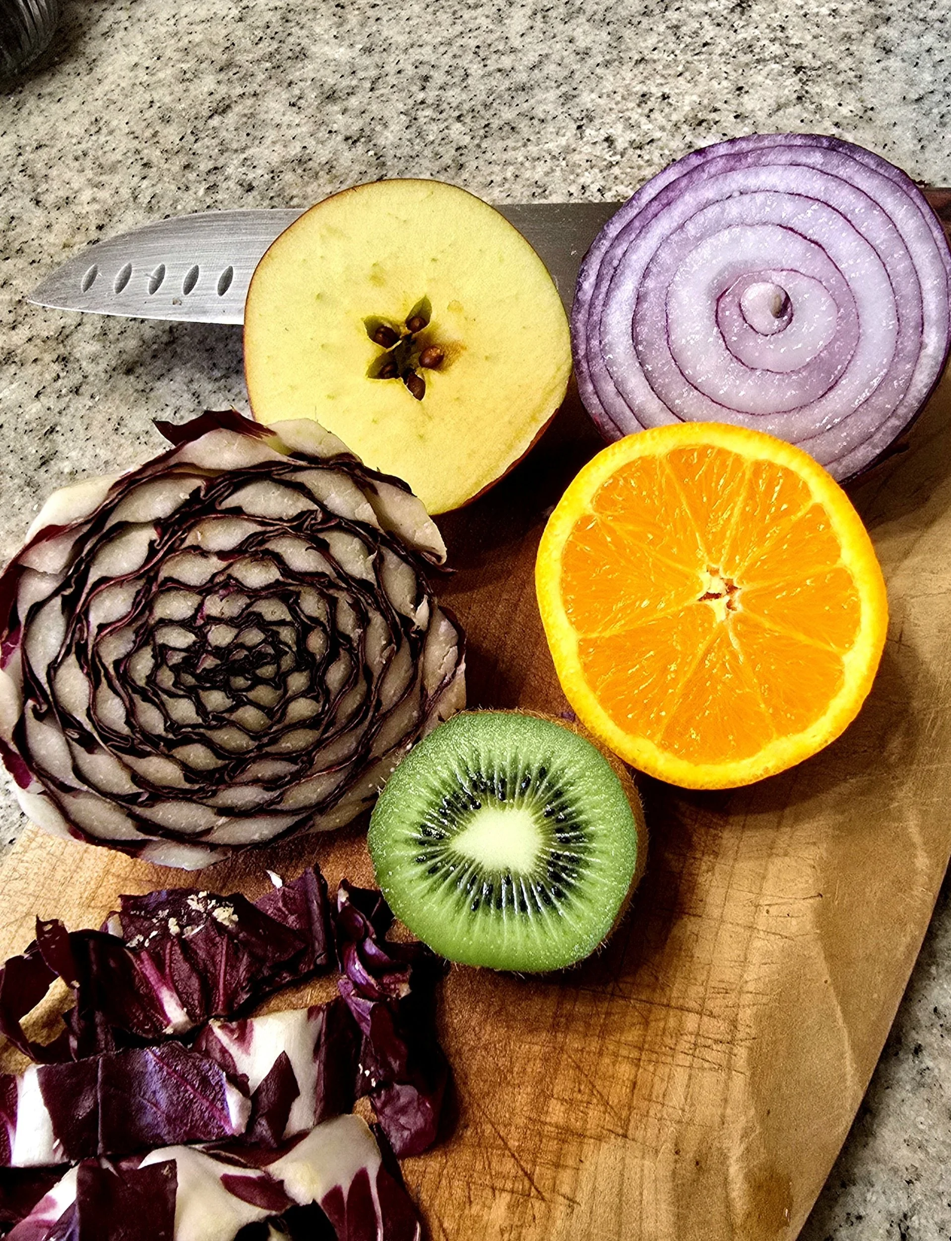 Sezione di frutti e ortaggi tagliati (arancia, kiwi, mela, cipolla, radicchio) che mostrano simmetrie naturali, colori viventi e strutture geometriche interne